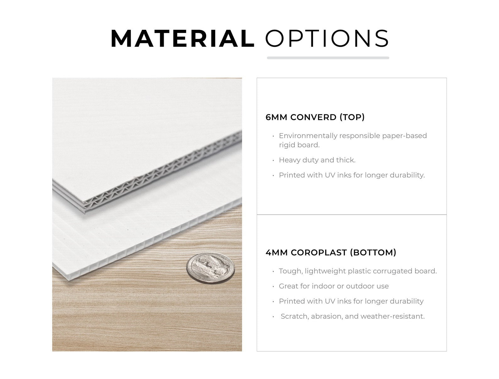 • 6mm ConVerd Board - Environmentally responsible paper-based rigid board. Recommended for repeat use or permanent displays. Heavy-duty & thick.