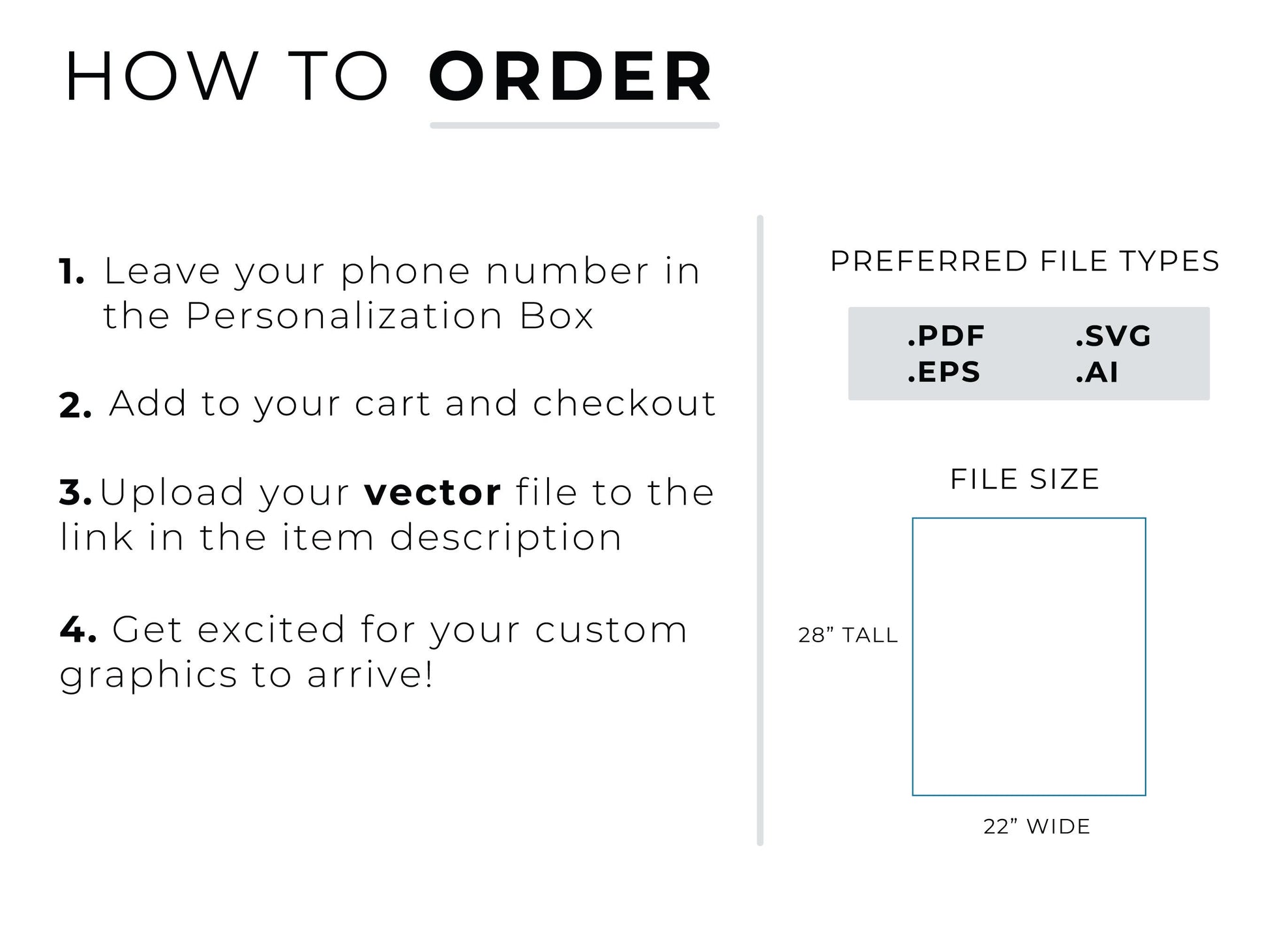 3. Immediately after ordering, please upload your logo/files to the link below. We highly recommend graphics to be in vector format (PDF, AI, EPS, or SVG). These files can be made infinitely large without losing quality.