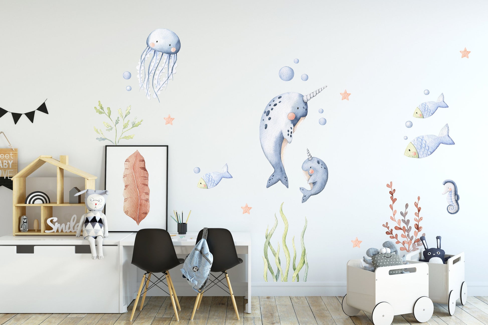 Reusable Fabric Wall Decal | Under The Sea | Nursery Wall Decals | Watercolor Decals | Neutral Nursery Decor | Ocean Playroom Decals